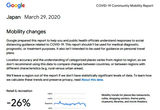 死者数が最も多いイタリアでは「小売店・娯楽」への出入りが94%減、「職場」が63%減となる一方、「住宅」は24%増となり、人々が不要不急の外出を抑え、自宅にとどまっていることがうかがえる。最近、外出禁止令が多くの州に出ている米国では、「小売店・娯楽」は47%減で、「職場」は38%減。一方で、週末や夜の外出の自粛を呼びかけている日本では、「小売店・娯楽」が26%減、「職場」は9%減にとどまった。外出を控えたり、自宅で勤務したりする取り組みが、主要国中で最も遅れている様子が浮き彫りになっている。外出自粛、遅れ目立つ日本 グーグル位置情報使って比較 - ライブドアニュース