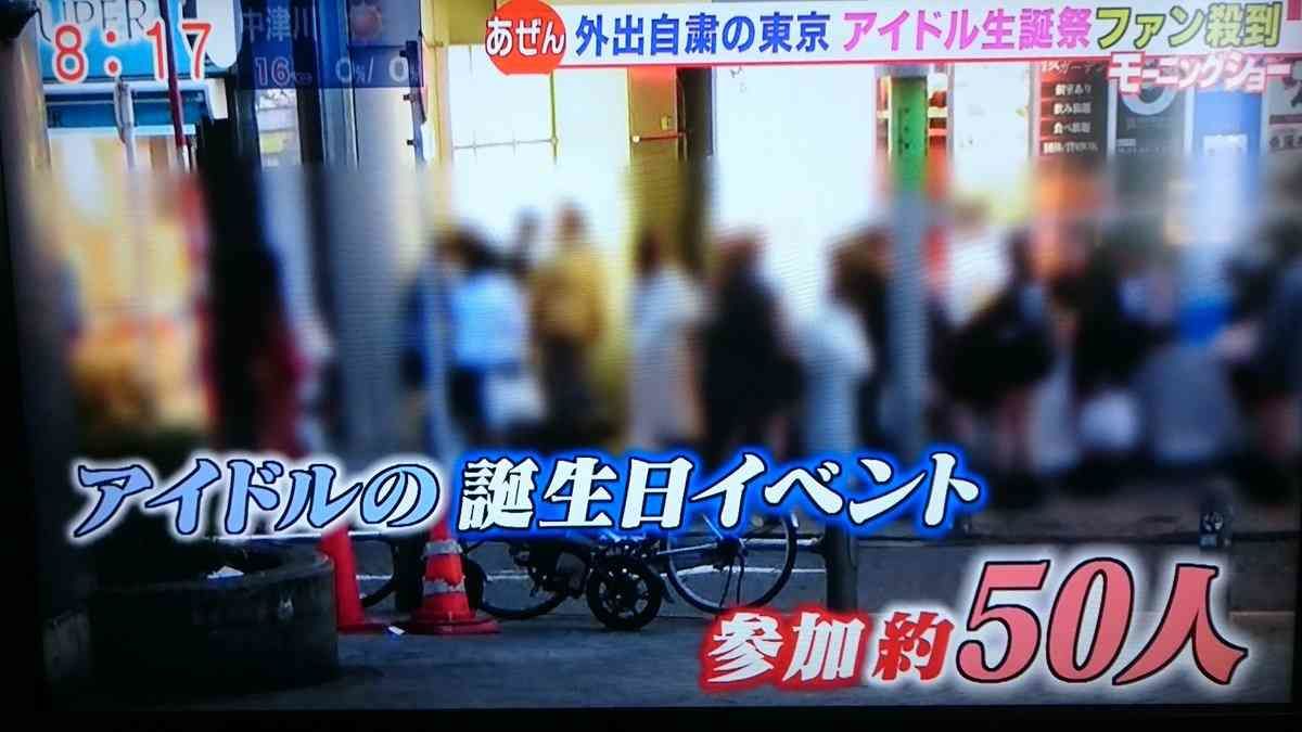 番組が「あぜん 外出自粛の東京 アイドル生誕祭ファン殺到」と紹介したのは週末に男性アイドルが開催したバースデーイベント。地下で窓がなく閉鎖された会場に約50人が参加。イベントでは男性アイドルと握手する機会もあった。参加した女性たちは「好きなアイドルだから」「いつものライブだったら絶対行かない」「怖かったですね」とコメント。また「友達5人連れてくるとアイドルと一緒に動画が撮影できる」特典があることから、ファンでない女性も誘われて参加したという。イベントを強行した男性アイドル側は「取材には応じられない」としている。男性アイドルが外出自粛要請の週末に生誕祭決行 参加女性「怖かった」 – 東京スポーツ新聞社