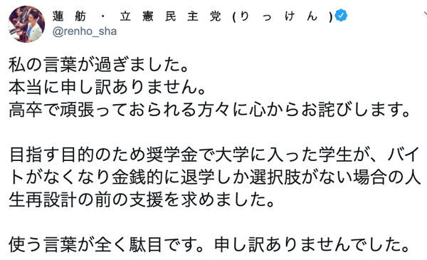 29日の議事録の写真とともに、「私の言葉が過ぎました。本当に申し訳ありません。高卒で頑張っておられる方々に心からお詫びします」と記した。蓮舫氏「高卒」発言を謝罪「高卒で頑張っておられる方々に心からお詫び」/デイリースポーツ online