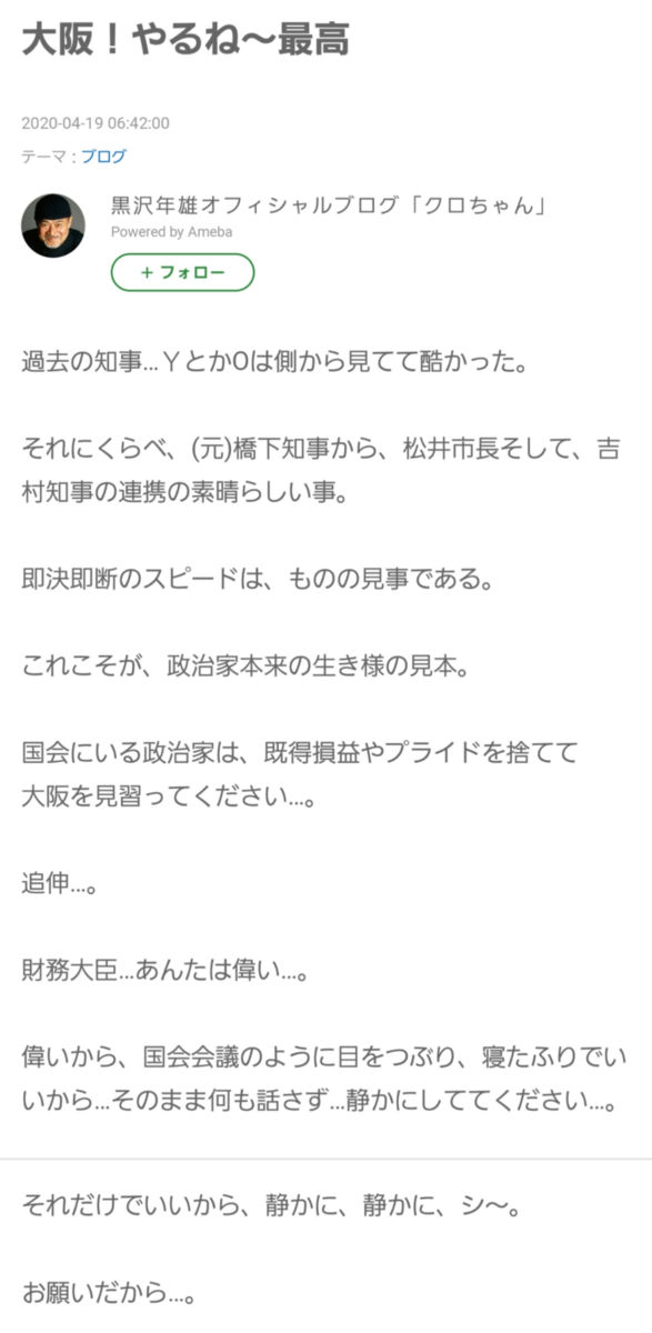 「官僚の言うことをやるだけなら政治家は要らない、まさにその通り!」猪瀬直樹氏が大阪府の吉村知事の意見に全面賛同 2020年4月28日 15時9分--- 本田圭佑×吉村大阪府知事、「良い流れ!」「吉村さん、寝てください」のやり取り反響 ---