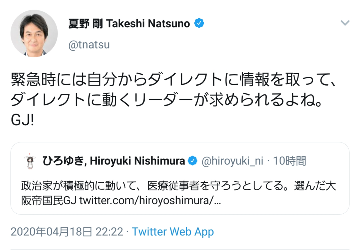 夏野 剛 Takeshi Natsuno @tnatsu 緊急時には自分からダイレクトに情報を取って、ダイレクトに動くリーダーが求められるよね。GJ