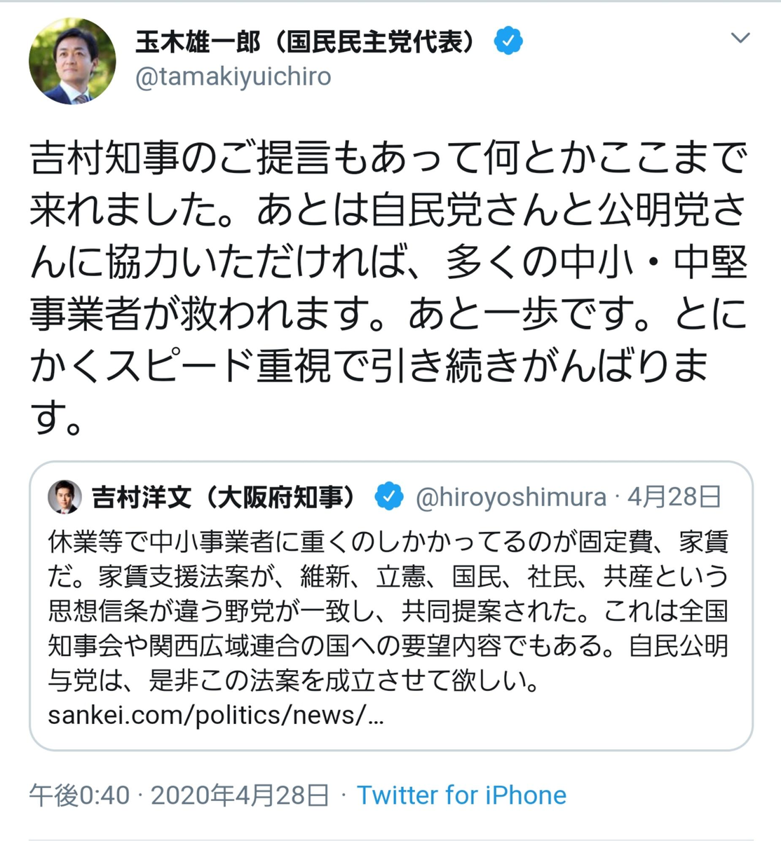 玉木雄一郎(国民民主党代表) @tamakiyuichiro 吉村知事のご提言もあって何とかここまで来れました。あとは自民党さんと公明党さんに協力いただければ、多くの中小・中堅事業者が救われます。あと一歩です。とにかくスピード重視で引き続きがんばります。--- 坂上忍、パチンコ店公表の吉村知事に「嫌われてもいいという腹のくくり方が見事」 ---