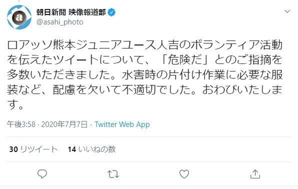 熊本県内の豪雨被害で、子供たちに泥まみれで復旧作業をさせたサッカーのジュニアチームに対し、医療関係者からツイッター上などで感染症リスクの指摘が相次ぎ、チームは、公式サイト上で非を認めて謝罪した。この作業を写真付きでツイッターなどで紹介した朝日・毎日両新聞にも、批判が相次いでおり、朝日は、「配慮を欠いて不適切」だとして謝罪し、毎日は、「ご意見を報道に生かしたい」などとした。子供たちは半袖・短パンで、
