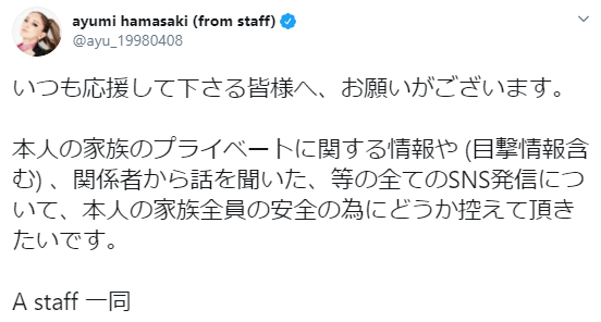 浜崎あゆみ公式ツイッターでファンにお願い「プライベート情報のSNS発信どうか控えて」