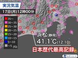 【速報】8月17日(月)静岡県浜松市で12時10分に41.1℃を観測し、国内の観測史上最高の気温に並びました。これまでの記録は2018年7月23日に埼玉県熊谷で観測された41.1℃でした。