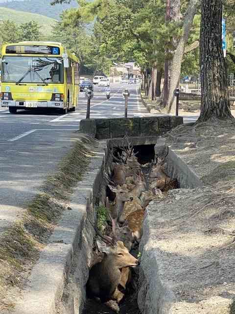 同庁によると、奈良市では同日午後3時までに最高気温37.9度を観測。道路は県庁前とあって市バスや車が多く通るなど交通量が多いが、溝が深いためシカにとっては涼しく安全な場所になっているようだ。猛暑でここ「シカ」ない? 奈良県庁前の道路溝 シカが涼求めひっそり集合(THE PAGE) - Yahoo!ニュース