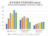 「進路に関すること」を挙げる割合は中学1年生から急激に増加し、高校3年生時点でも最も割合が高かった。一方、中学1年生から毎年増加しているのが「自分の容姿に関すること」で、とりわけ女子では高校3年生時点で「成績に関すること」を抜き、2番目に高い項目となった。「容姿の悩み」中学から増加 女子18歳で「成績」抜く