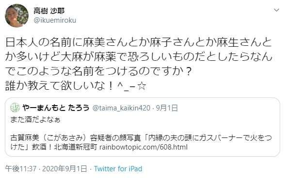 8月30日に同居する内縁の夫の頭にガスバーナーで火をつけて逮捕された古賀麻美容疑者のニュースを引用高樹沙耶さん「“麻”の付く名前」持論ツイートが異次元レベルの物議… - まいじつ