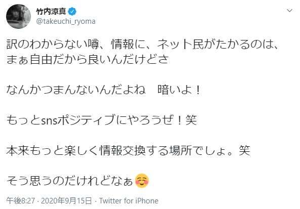 俳優の竹内涼真(27)が15日、自身のツイッターでSNSの使い方について「もっとポジティブにやろうぜ!」と呼びかけた。 竹内は、誹謗(ひぼう)中傷や根拠のない噂が飛び交う昨今のネット事情を憂い「訳のわからない噂、情報に、ネット民がたかるのは、まぁ自由だから良いんだけどさ なんかつまんないんだよね 暗いよ!」と自身のツイッターに投稿。「もっとsnsポジティブにやろうぜ!笑 本来もっと楽しく情報交換する場所でしょ。笑 そう思うのだけれどなぁ」と心の内をつづった。 これには「その通り!SNSは楽しい場所。攻撃する場所じゃない」「楽しい事、感動やプラスになる情報を交換して自分の人生を豊かにするものよね!SNSって!」「自由だけど、人を傷つけたり、不快にさせるのは違うよね」「俳優さんが言葉を発するのって凄く勇気が。言ってくれて嬉しいです」「涼真くんの言う通りだと思うし、そう思える涼真くんは本当に素敵です」と多くの賛同のコメントが寄せられた。
