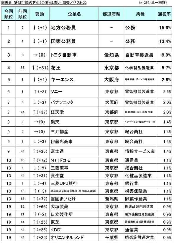 リスクモンスターの調査によると、知人や友人の勤め先を「うらやましいと感じる」と回答した人は35.2%。うらやましいと思う企業名は、1位と2位が地方公務員と国家公務員。トヨタ自動車が3位に入った。