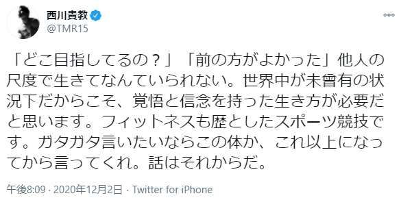 西川は「『どこ目指してるの?』『前の方がよかった』他人の尺度で生きてなんていられない。世界中が未曾有の状況下だからこそ、覚悟と信念を持った生き方が必要だと思います」と強調。西川貴教が筋肉美への誹謗中傷に「この体か、これ以上になってから言ってくれ」 – 東京スポーツ新聞社