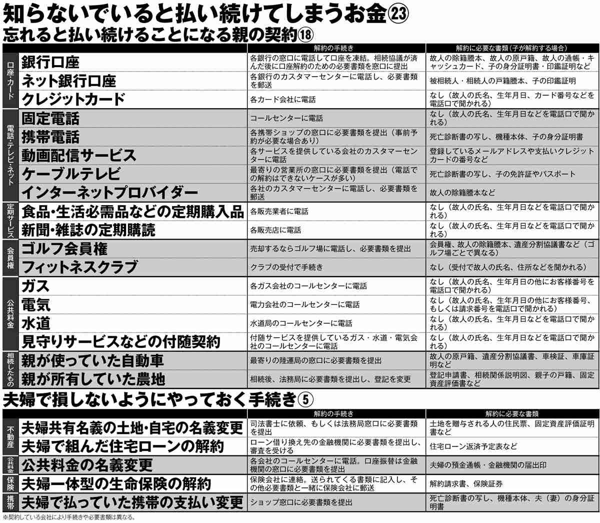 「銀行口座やクレジットカードからの自動引き落としは、本人死亡の連絡をすれば取引が停止されるはずです。ところが父のカードは複数あり、そのうちの1枚を止め損なったせいで、年会費のほか、さまざまなサービスの料金請求が父の死後も続いたのです」(三上氏) 2020年の11月にカード停止の連絡をしたが、「停止には2か月かかる」と言われ、今も月約10万円の支払いが続いているという。 「父はネットを使いこなしていたので、その他の契約も確認して解約するのは大変でした。ネット銀行、動画配信サービス、ケーブルテレビ、インターネットプロバイダーまで、それぞれにアカウントとパスワードがある。電話で解約しようにもなかなか繋がらず、繋がっても『本人確認のため』とたくさんの書類提出を求められました」ネットを使いこなしていた父が死去 家族を待っていた「解約地獄」 | マネーポストWEB