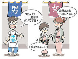 厚生労働省が公衆浴場の衛生管理について示した要領はこれまで、混浴を禁じる年齢を「おおむね10歳以上」としていたが、業界団体から「引き下げるべきでは」との意見が寄せられた。聖心女子大の植田誠治教授(学校保健学)らが厚労省の補助事業で実施した研究結果も踏まえ昨年12月、「おおむね7歳以上」に下げて各自治体に通知した。「混浴」の年齢制限が10歳→7歳に引き下げ検討 研究結果踏まえ国が通知 - ライブドアニュース