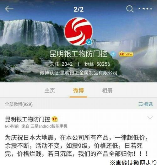 地震の影響で、九州地方はなお予断を許さない状況が続いているが、そうした中、中国のとある企業が日本で起きた地震を祝うメッセージとともに、“祝賀セール”を行う旨をSNSで表明し、中国のネットユーザーの怒りを買う出来事があった。現在、問題の投稿はすでに削除されている。 物議を醸したのは、昆明銀工金属製品有限公司(雲南省)の微博公式アカウント。同アカウントは4月17日、「日本の大地震を祝い、当社の製品を格安価格で提供します」とアナウンスし、続いて「余震が続けばキャンペーンは継続。9級の地震が起こればさらにお安く、日本が沈没すれば我が社の全商品を提供致します」とメッセージを投稿した。 この投稿はすぐさま多くのネットユーザーが知れ渡ることとなり、コメント欄には「歴史問題と地震を一緒にするな」「この恥さらしめ」などと批判が殺到。騒ぎが大きくなることを恐れたのか、同アカウントは問題のメッセージを削除した。 しかし、こうした心無いメッセージを投稿した企業はほかにもいくつか確認されており、例えば陝西省の自動車ディーラーは「日本の地震をお祝いします。3日間、私どものディーラーでお車の購入予約をしていただくと、とてもお得な価格でご提供致します」などと投稿。やはり多くのネットユーザーからの非難を受け、投稿を削除している。 一連の騒動を受け、一部の中国のネットユーザーは「日本人も四川大地震のときにお祝いのメッセージを出していた」などと反論し、当時の日本のネット掲示板のスクリーンショットを投稿するなどして、こうした行為を正当化しようとしているが、個人のネットユーザーと企業では立場がまったく異なるもの。また、こうしたメッセージの多くはそのほとんどが似た文脈になっていることから“炎上商法”を疑う声もあり、「まともに向き合うことが馬鹿らしい」との意見も出ている。中国企業が熊本地震を祝うセール 中国のネットで怒りの声 - ライブドアニュース