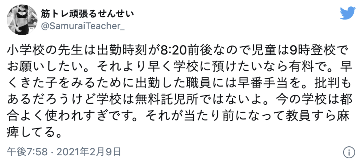 教員による「学校は無料託児所ではない」とのツイートが話題になっている。教員の出勤時刻より早く学校に子を預けたいなら有料にすべきと訴え。今の学校は都合よく使われすぎだとし、共感の声が多く寄せられている