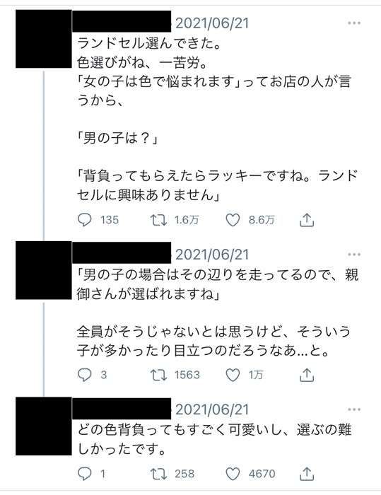 このツイートに対してリプ欄は、ランドセルを選びに行ったら、店員さんが「女の子は色で悩まれます」 男の子は?その違いにびっくり|まいどなニュース