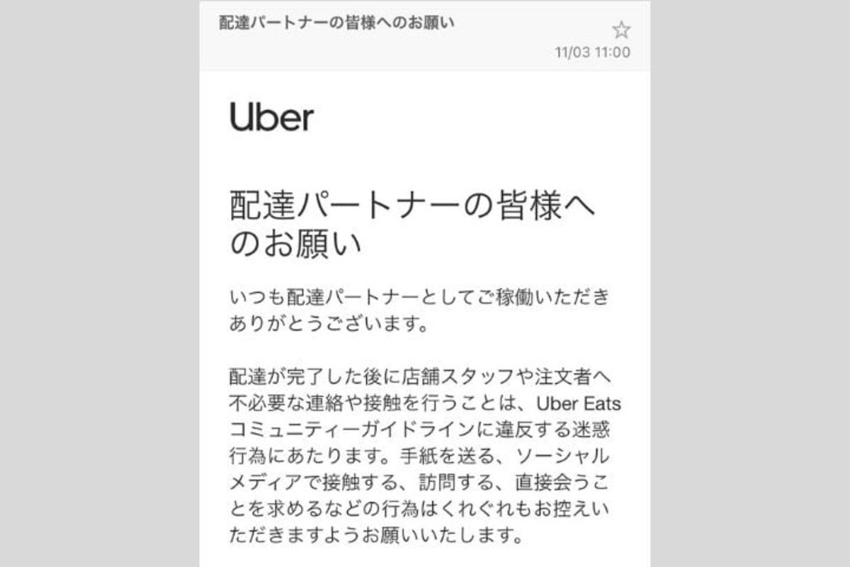 そこには、手紙を渡したりする迷惑行為など「Uber Eatsコミュニティーガイドライン」に抵触する行為をした場合、アカウント停止になる可能性があることなどが書かれていた。 「配達が完了した後に店舗スタッフや注文者へ不必要な連絡や接触を行うことは、Uber Eats コミュニティーガイドラインに違反する迷惑行為にあたります。手紙を送る、ソーシャルメディアで接触する、訪問する、直接会うことを求めるなどの行為はくれぐれもお控えいただきますようお願いいたします」ウーバー配達員に「利用客に手紙渡すな」と通知…先月には「ラブレター事件」が話題に - 弁護士ドットコムニュース