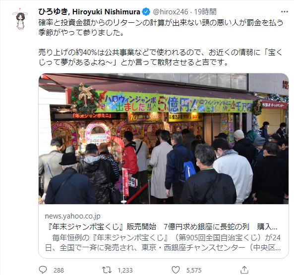さらに、この発言について《庶民が億万長者になるには宝くじしかないってこと。実際、当たってる人もいるんだから頭悪くないでしょう。》とコメントしたユーザーに対しては、《おいらの家庭も庶民ですし、グリーの田中さんも庶民だし、堀江貴文ことホリエモンさんも庶民だし、YouTuberヒカルさんも庶民出身。庶民から億万長者になった人は、IT起業家やYouTuberに大勢居ます。宝くじを買うと金持ちになれると考える頭の悪さのせいで貧乏のままなんだと思いますよ》と切り捨てていた。 ↓ 一連の言動に対し、ネット上では「的外れ」な指摘だと非難が相次いでいる。 《別に宝くじでお金持ちになれるなんて信じてない。》 《分かっていない。宝くじを買う人のほとんどは当たるなんて思っていない》 《ほとんどの人は本当に金持ちになれると思って買うのではなくて、抽選日までワクワクするのが楽しいんじゃないか》 《宝くじなんて、それでお金持ちになろうと考えている人は、そこまで多くないと思う。それを理解できないひろゆきは、全然わかってないなと思うよ。》ひろゆき 若者から絶大な支持も「宝くじ買うやつは馬鹿」発言で浮き彫りになった“庶民感覚”との決定的なズレ | 女性自身