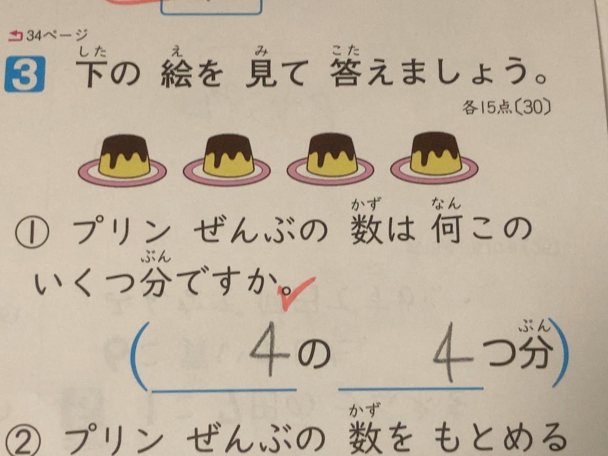 ちなみにテストのみ返却されたため、答えは分かっていないが「娘はかけ算を習っているので、かけ算の答えを求めているのなら『プリン1つが4つ』になるのかなと考えました」とのこと。