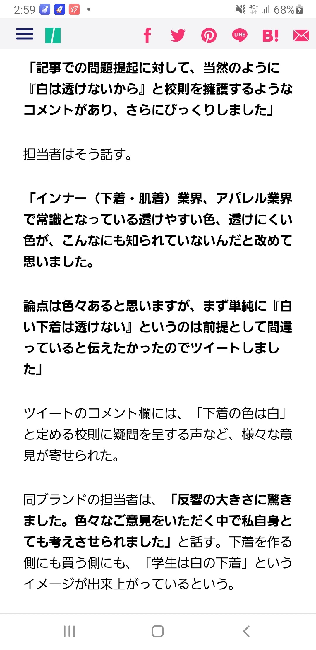 41 匿名さん 22/03/23(水) 19:38 普通に考えて、あえて透けやすい色を指定にしてんだよ。痴漢に遭いやすいだろし。黒と同じくらいくっきり透ける。 透けにくさに固執するなら、白と黒、ネイビーも黒程じゃないが透けるから、禁止にするべき。 ベージュの他に透けにくい色は、グレー と、ベージュピンクとか暗くてくすんだピンク。理論的に言ったら、透けにくさに固執するなら、その三色以外禁止にするはず。