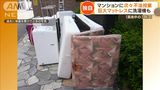 ■外部の人間が「真夜中の3時に」 巨大なマットレスに、洗濯機。さらに、まるまる一部屋分と思える量の家財道具が捨てられていたこともあったといいます。 しかも、これらの粗大ごみは、マンションの住人ではなく、外部の人間が持ち込んでいるというのです。 池田竜史さん:「(Q.毎回、同じ人物?)いえ、同じ人はおそらくあまり見ない」「(Q.毎回違う?)そうですね」「(Q.時間帯は?)(防犯カメラには)暗くなってからの映像が多くて、真夜中の2時、3時というケースもあります」 ■「捨てられる」情報共有か… ではなぜ、このマンションだけが狙われているのでしょうか。警察からは“ある可能性”を指摘されたといいます。 池田竜史さん:「『ここだったら捨てられるよ』というのが、色々なネットワークで広まっているのではというアドバイスを、警察からもらいました」「(Q.どこかで情報共有がされている?)はい。怒りが、どんどんわいてくる。本当に迷惑になるので、やめてほしいです」 今後は、引き続き警察と相談しつつ、より精度の高い防犯カメラを設置するなど、対策を強化していくということです。【独自】粗大ごみ“不法投棄” 一部屋分の家財道具も…狙われるマンション 住民困惑