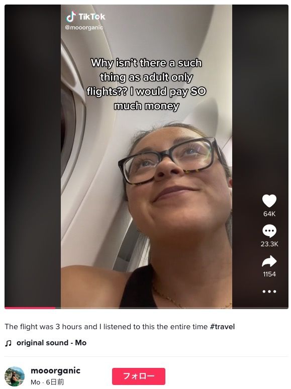 動画には席に座って宙を見つめるモーガンさんの姿があり、幼児の泣き叫ぶ声が聞こえてくる。モーガンさんは投稿に「3時間のフライトでずっとこれを聞いていた」と綴っており、後ろの席の幼児が3時間のフライトの間ずっと泣き叫びながらモーガンさんの椅子を蹴っていたという。【海外発!Breaking News】機内で3時間泣き叫ぶ幼児に嘆く女性「大人専用のフライトを」と懇願し物議醸す<動画あり> | Techinsight(テックインサイト)|海外セレブ、国内エンタメのオンリーワンをお届けするニュースサイト