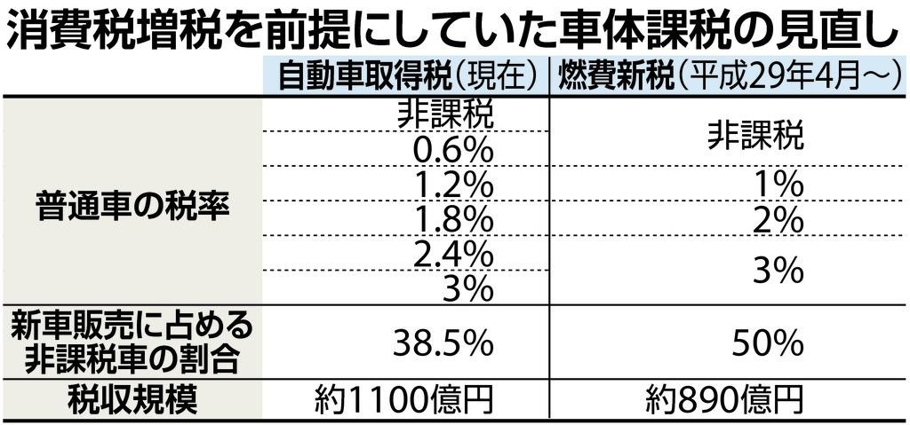 政府は、消費税率10%への引き上げを前提にしていた自動車購入時に燃費性能に応じて支払う新税について、消費税増税を延期しても予定通り2017年4月から導入する方向で検討していることが1日、分かった。同時に廃止する自動車取得税よりエコカーの税負担が軽く、全体で約200億円規模の減税となる。自動車業界の根強い要望に配慮する。燃費新税は予定通り実施も 来年4月 自動車業界の要望根強く