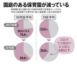 現在、国は園庭を持たなくても保育園の開設を認めている。そのため、都市部で新設される園は、園庭の無い園も多い。保育園を考える親の会の「100都市保育力充実度チェック」によると、2017年度の園庭保有率は100市区平均で76.6%だったが、22年度は69.8%に。東京23区平均では53.6%から39.8%へと大幅に低下した。千代田区、中央区、文京区、港区は園庭がある園は2割に満たない。 「園庭がないことで隣の敷地と建物が近くなり、窓を開ければすぐ隣の家、という状況を生んでしまいました。そうなると窓は開けにくくなる。園庭はいろんな意味でバッファーになっていたはずなんです。子どもが遊ぶだけの役割に留まらず、音も日当たりも風通しにも影響を与えます」(「こどものための音環境デザイン」代表理事の船場ひさおさん) 園庭がない場合、近隣の公園などで外遊びをさせるしかなくなる。同じような園がいくつもある地域では、小さな公園に何十人もの園児がひしめく状況も生まれている。都市部で「園庭」のない保育園が増加 「窓は開けにくくなり、音も日当たりも風通しにも影響」と専門家〈AERA〉