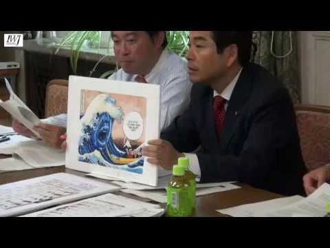 山井「ここにも描いてあるように、安倍さんの顔で日本の津波からG7の首脳の方々が『あの大馬鹿野郎から逃げようぜ、逃げたほうがいいよ』という、これイギリスのTIMESという有力新聞ですよね。つまり、安倍総理が国内で国民に言っていることは、捏造なんじゃないの?ということですよ。」