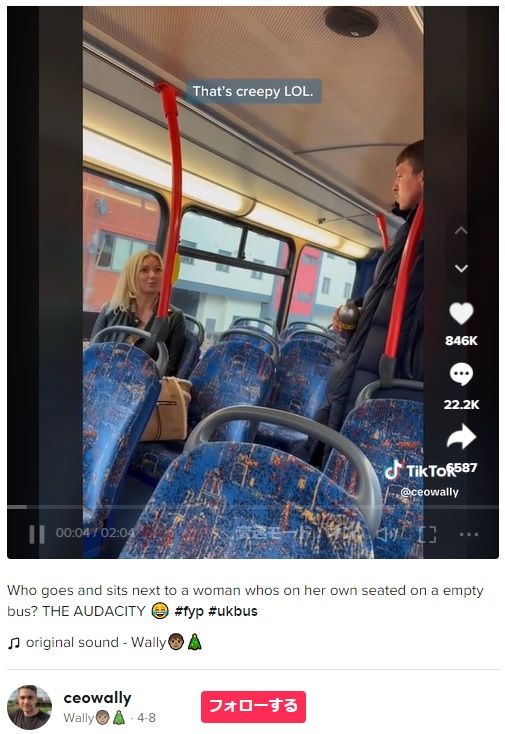 空いているバスや電車では、互いに距離をとって座るのが一般的だ。しかしイギリスのバスで先日、ほぼ空席だったにもかかわらず男が女性の隣に座ろうとした。女性は1人だったが、勇気を出して声をあげた様子がTikTokで公開され、注目を集めた。英ニュースメディア『The Sun』などが伝えている。 話題の動画は現地時間7