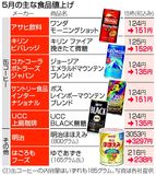 値上げの波は5月も収まらない。帝国データバンクが28日発表した主要食品195社の集計によると、同月の食品値上げは824品目に上った。缶コーヒーについては、飲料大手各社が1998年以来25年ぶりとなる値上げに踏み切る。休憩時間に値上げの重みを感じそうだ。