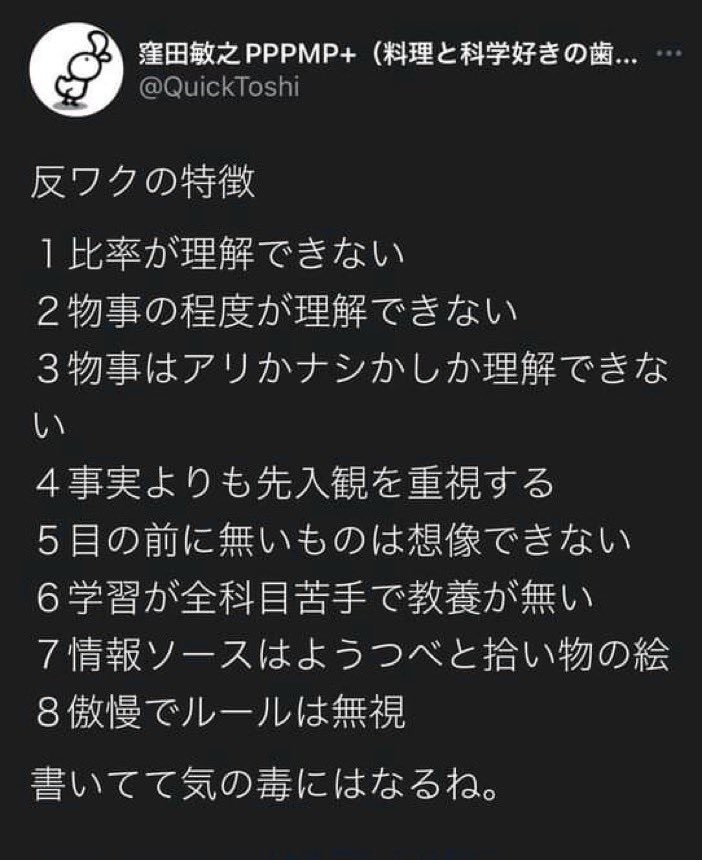 ただワクチン打つななんて事は誰も言ってないから、ワクチンが安全で効果抜群だと思うなら、コロナが世界から一つ残らず無くなるまで