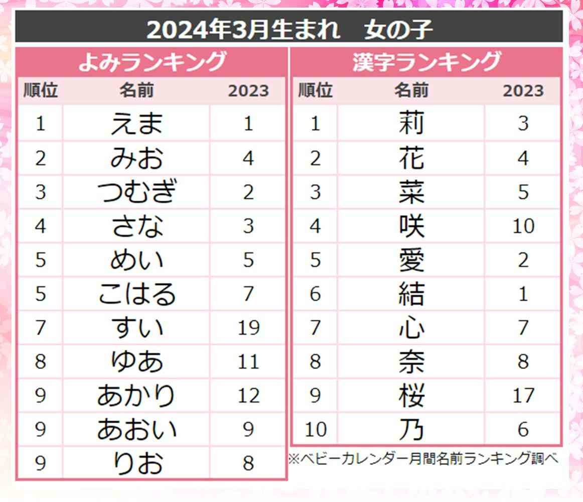 2024年「3月生まれベビーの名付けトレンド」が発表されました。男の子と女の子、それぞれの1位になったのはどんな名前なのでしょうか。