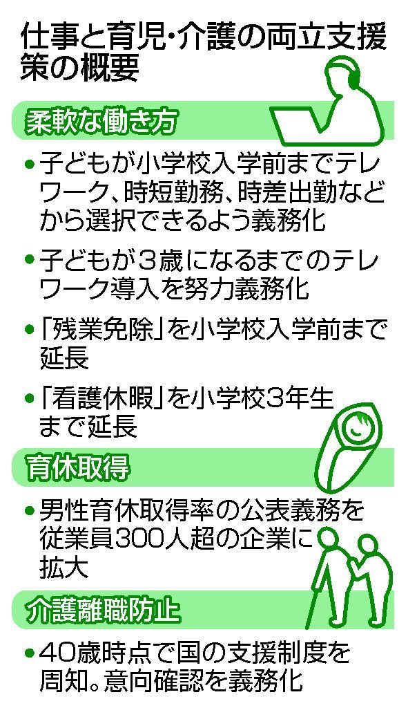 子どもが3歳から小学校に入学するまでの間、テレワークや短時間勤務、時差出勤などの制度を二つ以上用意し、従業員が選べるようにする制度の導入を企業に義務付けることが柱。介護を理由に離職する人を減らすため、支援制度の周知も徹底させる。家庭の事情によってキャリア形成が妨げられることのない社会の実現を目指す。 労働政策に詳しい第一生命経済研究所の的場康子主席研究員は、「育児や介護の経験もキャリアにとって大事な要素だ」と指摘。企業に対し、「男性も育休後にテレワークなどを利用できるよう働き方を変える工夫をしなければいけない」と訴えている。仕事と両立支援、企業に義務 改正育児・介護休業法が成立―働き方に選択肢、来春以降施行:時事ドットコム
