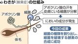 日本臨床皮膚科医会の江藤隆史会長の話 「腋臭症は、においを止める有効な薬がなく、薬で汗を抑えるか、手術でわきの下のアポクリン腺を取り除くかだった。日常生活に支障をきたすほど悩む人もおり、薬として使えるようになれば多くの人が喜ぶだろう」「わきが」原因の細菌特定、においの原因菌だけ破壊する酵素の合成にも成功