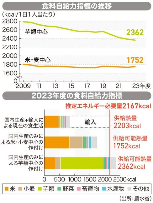 農水省は、国内で食料を最大限まかなう能力を示す、2023年度の「食料自給力指標」を示した。イモ類をできるだけ作付けた場合の供給量は1人1日当たり前年度比24キロカロリー減の2362キロカロリーで過去最低となった。農業者の減少などで低下傾向にあり、労働力確保が急務となっている。 世界人口の増加や気候変動などにより、食料供給を巡るリスクが世界的に高まっている。同省は、食料自給力の維持・向上へ、労働力の確保や省力化などの技術改善が重要とした。食料自給力が過去最低 芋類中心、23年度 人手不足が深刻 / 日本農業新聞公式ウェブサイト
