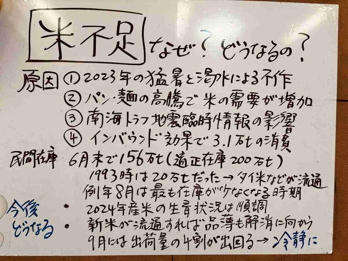 玉木氏は、米不足の主な原因として 【1】2023年の猛暑と高温による不作 【2】パン・麺の高騰で米の需要が増加 【3】南海トラフ地震臨時情報の影響 【4】インバウンド効果で3.1万㌧の消費 の4点を挙げた。 玉木氏は、2024年産の米の生育状況は順調で、新米が流通すれば品薄も解消に向かうと強調。「9月には出荷量の4割が出回る」として、冷静な対応を求めていた。国民・玉木代表「まもなく新米が出回る」“令和の米騒動”を農水省&集荷団体にヒアリング 原因や今後を解説|よろず〜ニュース