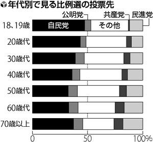 自民、比例第1党の勢い…10代の半数与党支持 読売新聞社が実施した終盤情勢調査では、比例選(改選定数48)は自民党が序盤情勢調査から伸ばし、2013年参院選に続いて比例選第1党をほぼ確実にする勢いだ。 与党で比例選過半数をうかがう。民進党など野党は反転攻勢をかけられていない。 自民党は13年参院選並みの18議席獲得も視野に入ってきた。年齢別に見ると、全世代で他党を上回る支持を得ている。特に若年層に強く、18、19歳は5割近くが自民党を支持している。18、19歳は安倍内閣の経済政策を6割弱が評価していて、30歳以上の世代よりも10ポイント以上高くなっている。 自民党は20歳代で4割強、30歳代でも4割弱の支持を集めている。 新たに選挙権を得た18、19歳は、半数以上が与党を支持している。自民、比例第1党の勢い…10代の半数与党支持