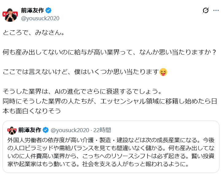 前澤氏「ところで、みなさん。何も産み出してないのに給与が高い業界って、なんか思い当たりますか?」