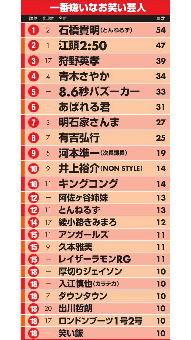 ■好きな芸人トップ3に共通するリーダー像とは 過去12回の調査すべてで1位。『お笑い向上委員会』では後輩芸人に技を伝授する姿も見られる(写真:中村嘉昭 辺見真也 佐賀章広) 「好きな芸人」1位は明石家さんま。過去12回行った本誌の調査で一度もその座を譲ったことがなく、今年も2位に大差をつけた。さんまに続いたのは博多華丸・大吉。3位は前回8位から大きく上昇したさまぁ~ず。この3組は「後進の発掘・育成を冠番組で実践」という共通点がある。 「嫌いな芸人」では逆転劇が起きた。長らく1位だった江頭2:50が2位に後退し、代わりに昨年2位だった石橋貴明が首位に。ネットで「実はいい人」という評判が広まった江頭だけに、「嫌い」に挙げる人が徐々に減ってきた結果と見てよさそうだ。江頭は「好き」でも昨年から5ランクアップの15位につけている。 「嫌いな芸人」は、石橋貴明が初めて1位に。首位を江頭2:50から奪ったのは、2011年の島田紳助以来2人目となる。 石橋を嫌いな理由として最も多かったのは「キャラクターが嫌い」(82%)。「芸もないのに先輩面しているところが嫌い」(45歳男性)に代表される、中高年男性からの辛辣な意見が目立つ。 54歳になり、最近は老眼鏡をかけていることも多い石橋。若い頃のように暴れまわる場面はなくなっているにもかかわらず「嫌い」に選ばれているのは、ゴールデンのレギュラー番組を何本も持っていた頃のいじめキャラが強烈に焼きついているからとも考えられる。全世代の男性と35~44歳女性で1位という結果は、男性芸人に対する様々なやんちゃをリアルタイムで見てきた世代と重なる。ちなみに25~34歳女性での「嫌い」は0票だった。嫌いな芸人、石橋貴明が初の1位 江頭2:50は2位に |エンタメ!|NIKKEI STYLE