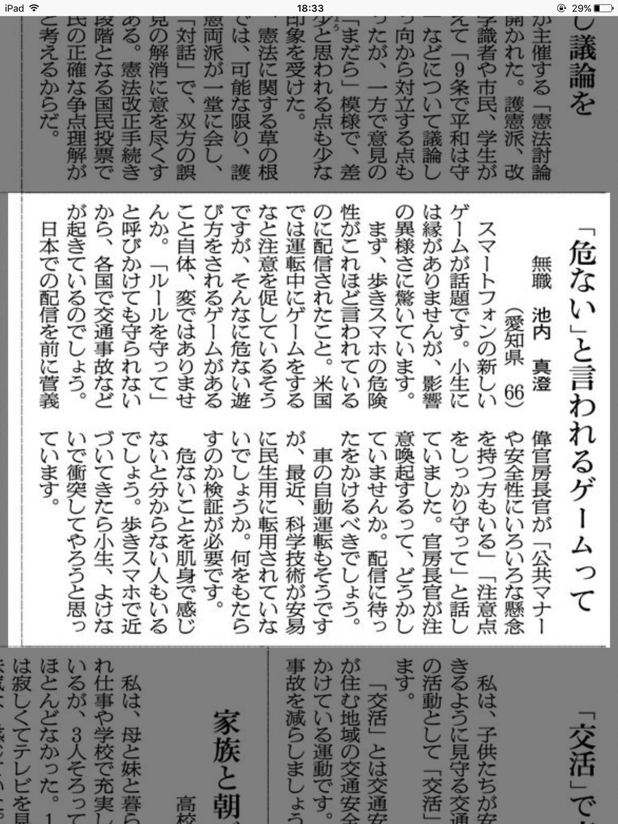 まず、歩きすスマホの危険性がこれほど言われているのに配信されること。米国では運転中にゲームをするなと注意を促しているそうですが、そんなに危ない遊び方をされるゲームがあること自体、変ではありませんか。「ルールを守って」と呼びかけても守られないから、各国で交通事故などが起きているのでしょう。