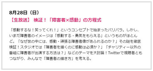「障害者=感動、勇気をくれる」はおかしい? NHKが「24時間テレビ」放送日に生放送で討論番組:コメント1