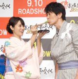 俳優の佐々木蔵之介、女優の深田恭子が6日、都内で行われた映画『超高速!参勤交代リターンズ』(10日公開)お月見餅つきイベントに着物姿で出席。もみじ柄の着物に身を包んだ深田に、佐々木は「着物が本当にお似合いですね」とメロメロだった。  映画冒頭で2人が祝言をあげるシーンがあるが、佐々木は「そのとき『あぁ姫美しいな』と思ったが、きょう着物姿では1年ぶりにお会いした。ますます輝きがある姫にお会いして、うれしい」とべた褒め。さらに「最近、女性のどんな姿が好きかと聞かれると、すべて着物が好きと答える。姫のおかげです」とぞっこんだった。  さらに佐々木も餅つきをすることになり、気合を入れて裸足で挑戦。数回杵で振り上げると息が上がり、汗だくに。ご褒美に深田がおもちを「あ~ん」と食べさせると、「いままで食べたおもちの中で一番おいしい。つきたてで温かいし、それに深田恭子さんが食べさせてくれる。めちゃくちゃおいしい!」と大喜びだった。