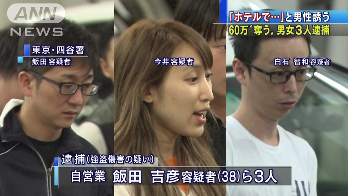 東京・新宿区で25歳の女がホテルに男性を誘い、その後、現れた仲間の男2人とともに全身を殴るなどの暴行を加えて、約60万円を奪ったとして逮捕されました。 自営業の飯田吉彦容疑者(38)ら3人は6月、新宿区四谷のホテルの一室で「持っている物を全部出せ」などと46歳の男性を脅し、傘などで顔や背中を殴って約60万円を奪った疑いが持たれています。捜査関係者によりますと、今井亜理沙容疑者が金の貸し借りを巡って男性を誘い、2人でホテルの部屋に入った直後に飯田容疑者らが押し入って男性に暴行を加え、無理やり服を脱がせたということです。男性は全身を打撲する全治2週間のけがをしました。取り調べに対し、飯田容疑者らは「暴力はふるったが、金は奪っていない」などと容疑を一部否認しています。ホテルに誘い出し暴行 “60万円奪い”男女3人逮捕(テレビ朝日系(ANN)) - Yahoo!ニュース