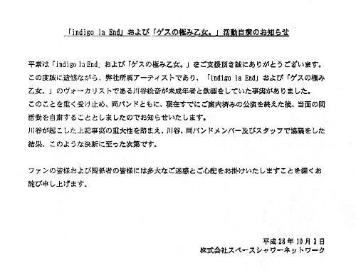 ロックバンド「ゲスの極み乙女。」のボーカル・川谷絵音(27)が3日、活動の自粛を報道各社へのFAXで発表した。  川谷との交際が報じられた未成年のタレント・ほのかりん(19)が、その席で飲酒していたと一部で報じられたことを受け、川谷の所属事務所は川谷が未成年のタレントと飲酒していたことを事実と認め、川谷、メンバーと協議して自粛を決めた。  ▽事務所のコメント全文  平素は「indigo la End」および「ゲスの極み乙女。」をご支援頂き誠にありがとうございます。  この度誠に遺憾ながら、弊社所属アーティストであり、「indigo la End」および「ゲスの極み乙女。」のヴォーカリストである川谷絵音が未成年者と飲酒をしていた事実がありました。  このことを重く受け止め、両バンドともに、現在すでにご案内済みの公演を終えた後、当面の間活動を自粛することとしましたのでお知らせいたします。  川谷が起こした上記事実の重大性を踏まえ、川谷、両バンドメンバー及びスタッフで協議をした結果、このような決断に至った次第です。  ファンの皆様および関係者の皆様には多大なご迷惑とご心配をお掛けしますことを深くお詫び申し上げます。  平成28年10月3日  株式会社スペースシャワーネットワーク
