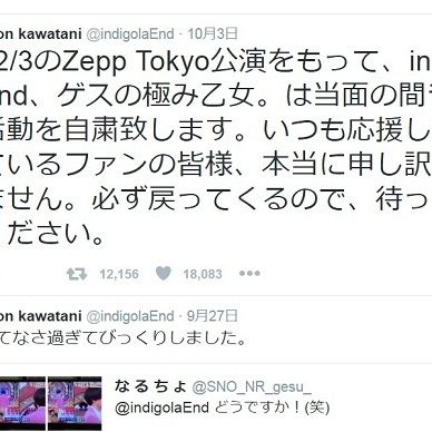 川谷絵音のTwitterより 今年1月にベッキーとの不倫が報じられたゲスの極み乙女。のボーカル・川谷絵音(27)が、ついに活動自粛へ追い込まれた。9月29日発…