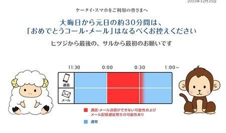 いわゆる“あけおめコール”に関する通信事業者側からのお願いで、毎年元日になった瞬間から「あけましておめでとう」というコールやメールが集中するために呼びかけている。事業者たちの予測では、年明けから約30分間メールや通話が制限される可能性があるとしている。