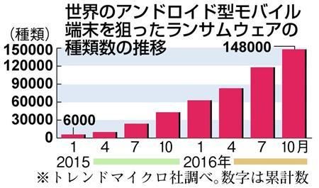 パソコンのデータを開けないようにし、復元のための金銭を要求する「ランサムウェア(身代金要求型ウイルス)」の標的が、スマートフォンなどのモバイル端末にも移行し急増していることが5日、分かった。今春には日本語表示のタイプが初確認されたほか、利用者の顔写真が「脅し」に使われる例も発覚している。さらに悪質な手口に進化することも予想され、専門家は注意を促している。(福田涼太郎)  ◆ロック解除に金銭要求  「注意!お使いのデバイスがロックされている」。操作が一切できなくなったスマホの画面には、デジタル数字のカウントダウンとともに、「残り時間は、罰金を支払います」とする意味不明の日本語の警告が表示。下部には、撮影した覚えのない自分の顔写真が「犯罪者情報」として掲載されている-。  これは、ランサムウェアに感染したスマホの一例だ。写真は、スマホが勝手にシャッターを切って撮られたものとみられている。  ネットセキュリティー会社「シマンテック」(東京)などによると、犯人側はこうした状態を解除する費用として数千~数万円の電子マネーや仮想通貨などを要求する。自力で復旧するには、スマホの初期化や修理を余儀なくされるケースも多い。同社は「(被害者側が)今後も支払うよう、要求に応じれば復旧させることが多く、金額も抑えている印象だ」と巧妙な仕掛けを説明する。  ◆1年で種類3倍以上に  ランサムウェアは、ウイルスが仕組まれたアプリをインストールすることなどで感染する。そのため、アプリの入手先が比較的自由な基本ソフト「アンドロイド」搭載型のスマホの感染例が圧倒的に多いという。  ネットセキュリティー会社「トレンドマイクロ」(東京)によると、世界で確認されたアンドロイド型を狙ったランサムウェアの種類は、昨年10月は累計4万3千種類だったが、今年10月には3倍以上の14万8千種類まで増加。国内でのウイルス検出数は月平均1万6千件以上となっており、「正確な実態は不明だが、潜在的な被害はかなり多い」と分析する。  実態がつかめないのは、感染した引け目や支払う金額の低さなどから、相当数の被害者側が警察に通報していない可能性があるためだ。  ◆「暴露系」への進化懸念  ある警察関係者は「今後はより強力な種類のウイルスが出てくるかもしれない」と懸念を示す。具体的に考えられているのは「暴露系」への移行だ。スマホから写真などのデータを抜き取り、「ネット上などで公開しない」ことを条件に金銭を要求すれば、被害者側が支払いに応じる可能性が高まるとみられるためだ。  ランサムウェアに詳しい神戸大大学院の森井昌克教授(情報通信工学)は、こうした手口が出てくることは「時間の問題だ」と指摘。「不要なアプリは入手せず、こまめにセキュリティーソフトをアップデートする。怪しいメールも開かない。最低限のことを守ることが大事だ」と予防策について話している。