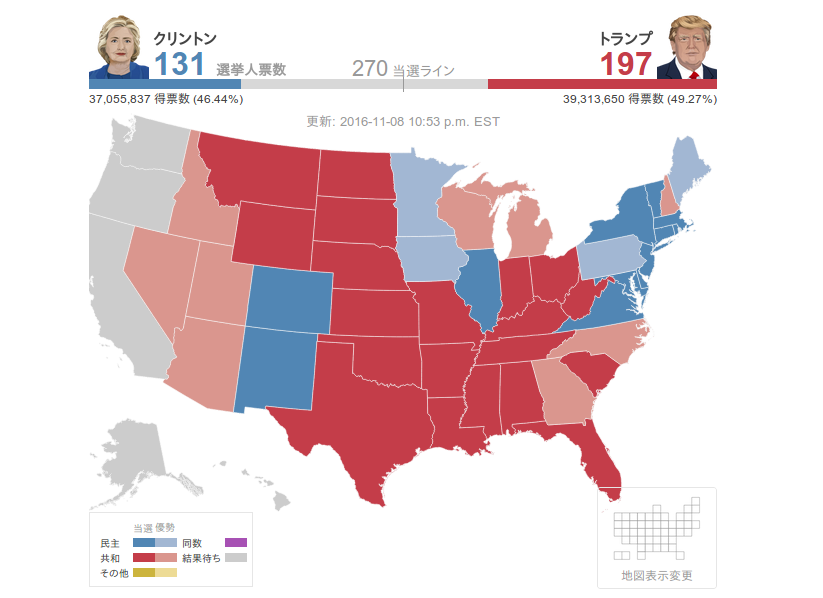 8日(日本時間9日)に投開票の米大統領選は、激戦州の一つと目されていたオハイオ州で共和党のドナルド・トランプ候補の勝利が確実となった。これまでの選挙人獲得数はトランプ候補が164人、民主党のヒラリー・クリントン候補が109人。過半数は270人。米大統領選:オハイオでトランプ氏勝利 選挙人164人に - 毎日新聞