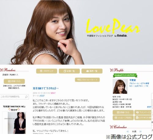 タレントの平愛梨(31歳)が11月11日、一部週刊誌に関ジャニ∞・丸山隆平(32歳)との“密会”が報じられたことについて、公式ブログで全面否定している。 11日付けのエントリー「耳を傾けて下されば…」では、まず、「私ごとではございますがこちらのブログで思いをつづります。また、フライデーさんに掲載されました。以前も妊娠している…とありもしないこと書かれましたが、今回も誤解されるような書き方だったので、どうせ書くなら真実を!と思いこの場をお借りします」と、今回、報道に言及する理由を説明。 “密会”とされた日は、「私が舞台でお世話になった監督 西田先生がご結婚、お子様が誕生されたのでそのお祝い!ということで3人で食事しよう!となりました。私の近況なども話し西田先生達は自分のことのように喜んでくれました」といった趣旨の集まりだったという。 報道の中では、友人の話として「実は愛梨ちゃん、長友さんとの婚約を喜ぶ一方で、マリッジブルーに陥っているみたいなんです」「親しい友人に『本当にうまくいくのかな…』『結婚に実感がわかない』と不安を漏らしていて、周囲も心配しているんです」、テレビ局関係者の話として「(平は)聞き上手で優しい丸山には愚痴をこぼしやすかったのでしょう」などと書かれていたが、平は「私、マリッジブルーなどなってません! 不安にもなってません。愚痴を聞いてもらったなどありえません! そんな話しすらしたことないです」と、強く否定した。 そして「このようなありもしない記事だったので色んな方に誤解させてしまったこと深く申し訳なく思います。長友さんや周りの方々、丸先輩や西田先生に関係するたくさんの皆様、応援して下さる皆様に不愉快な気持ちにさせてしまって本当にすみません。本当にごめんなさい」と謝罪している。平愛梨、関ジャニ∞丸山との密会報道を強く否定
